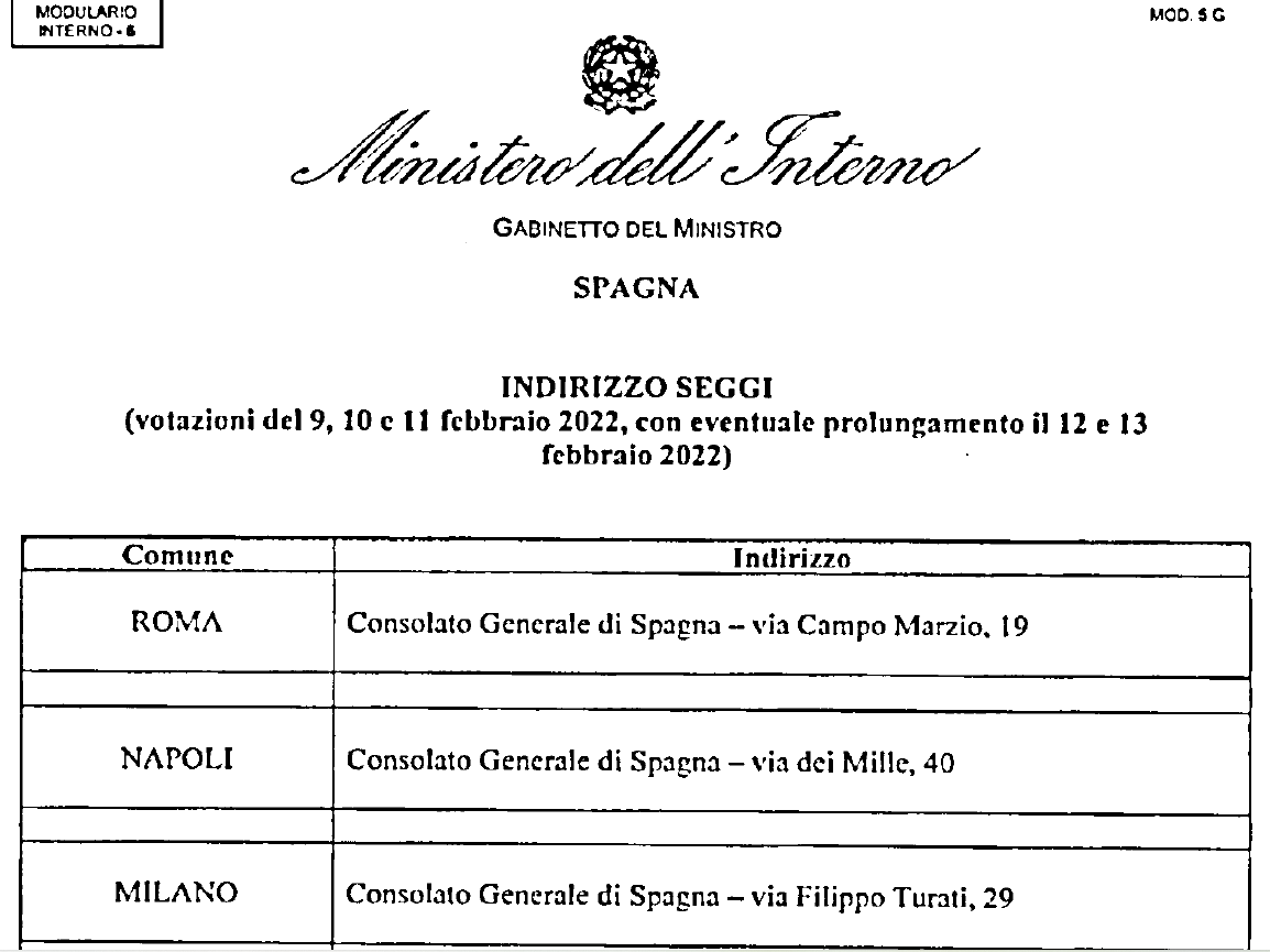 La Prefettura di Novara ha comunicato gli indirizzi dei seggi elettorali presso cui possono recarsi i cittadini spagnoli residenti in Italia, per votare alle elezioni in oggetto nei giorni 9, 10, 11 febbraio con eventuale prolungamento nei giorni 12 e 13 febbraio.